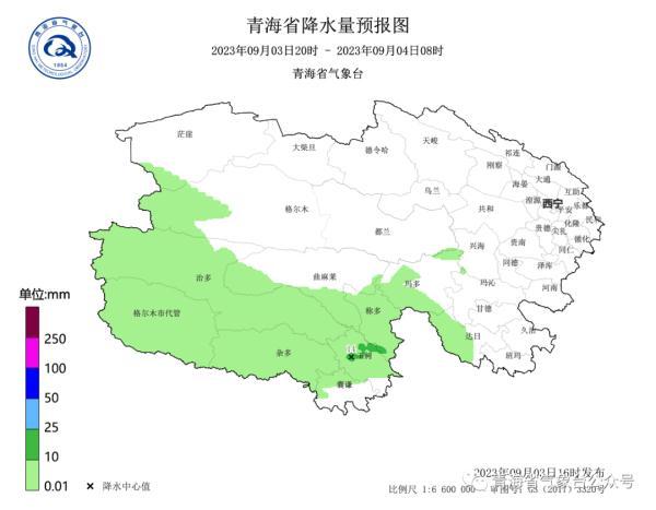 9月3日20时~9月4日20时:今天夜间,玉树大部及玛多、达日有小雨或阵雨,其中称多、玉树市的部分乡镇有中雨,省内其余地区晴或多云。明天白天,海南大部、黄南南部、玉树大部、果洛及都兰、格尔木市有小雨或阵雨,省内其余地区晴或多云。