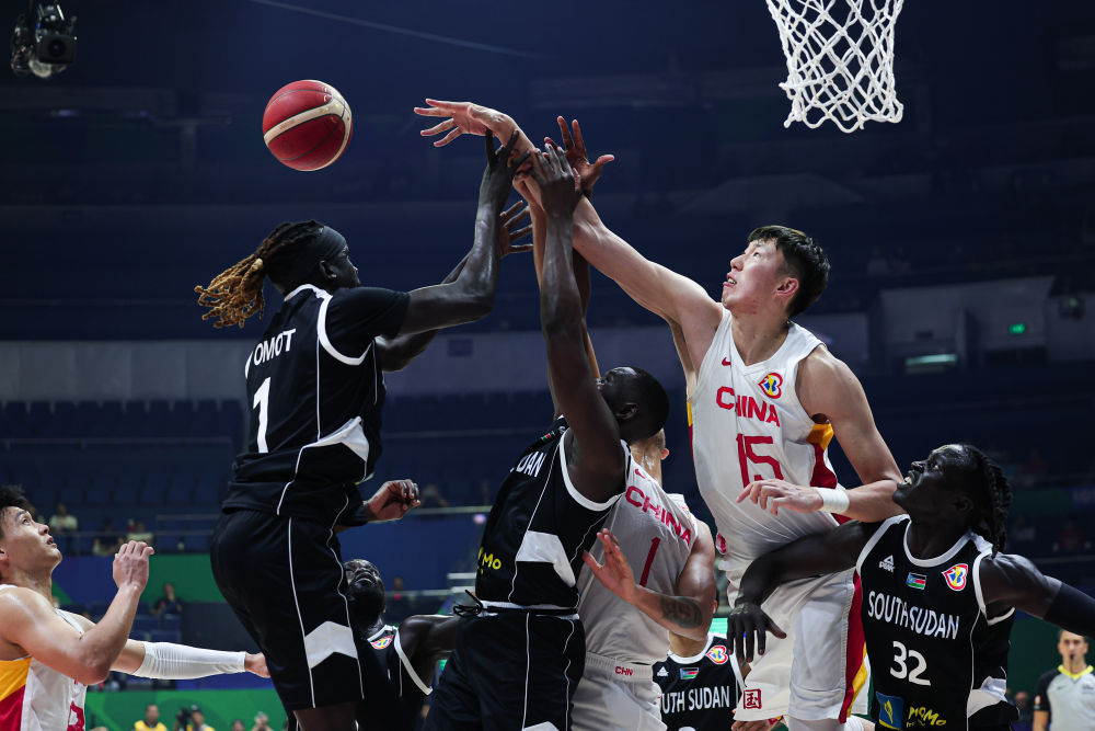 8月28日,中国队球员周琦(右二)在比赛中拼抢。当日,在菲律宾马尼拉举行的2023年篮球世界杯B组小组赛中,中国队以69:89不敌南苏丹队。新华社记者 吴壮 摄