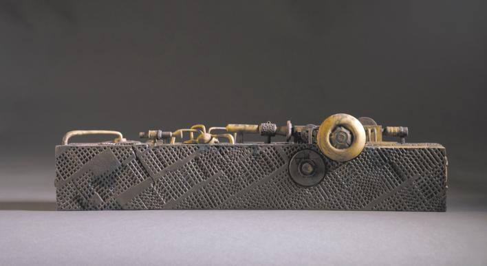 譬如陈君的陶艺作品《工业·人》,以工业机器零件、钢筋、石头为载体进行有序组合,作品整体透露出一种冰冷的机械感和对工业时代的回忆。时代的发展与进步满足和提高了人的物质需求,同时也给人带来一些负面影响,这种影响投射在人的精神层面、环境层面和社会层面等,导致现代人更加地焦虑,同时也警示人们,工业无序发展会造成严重后果。