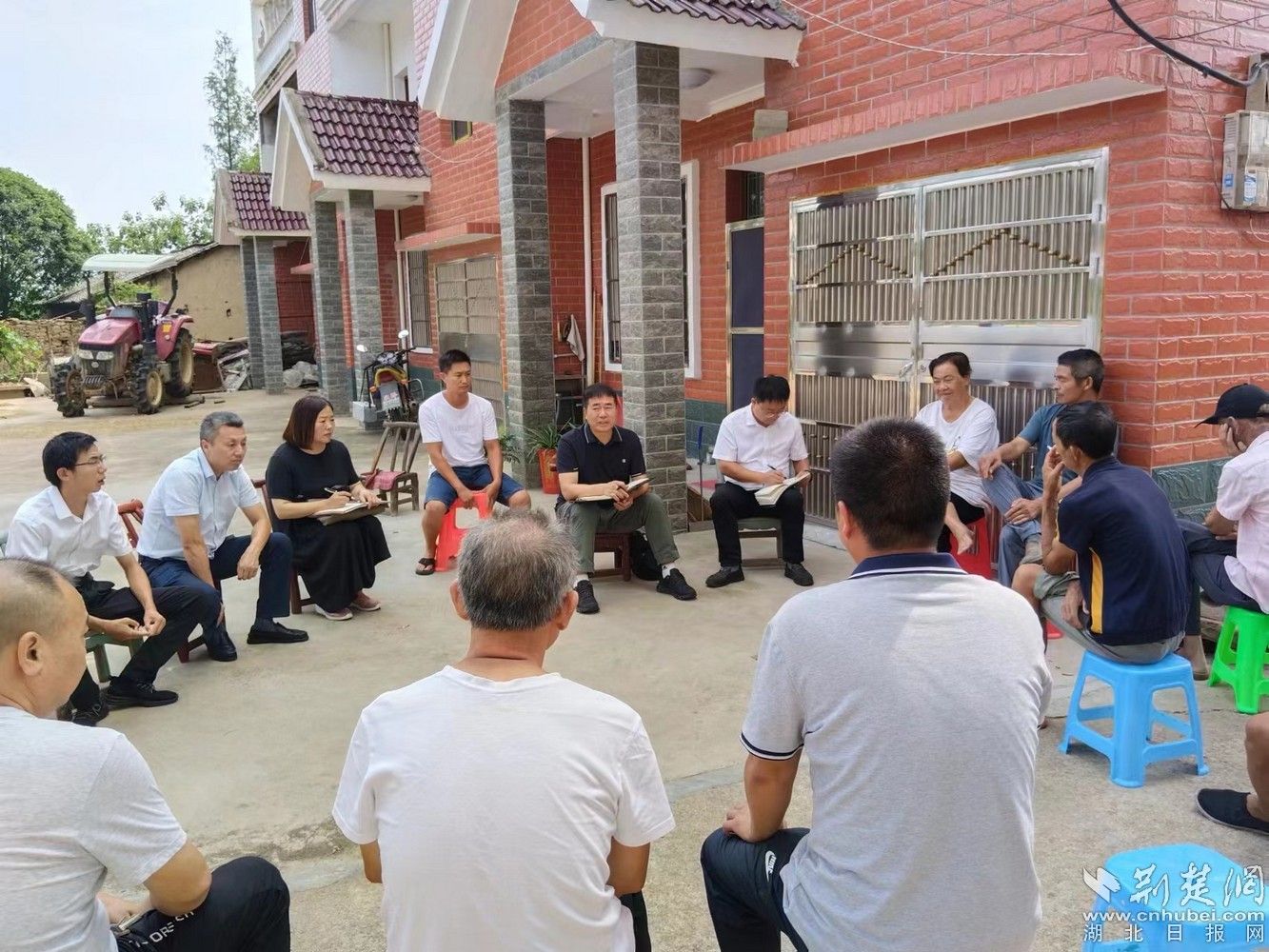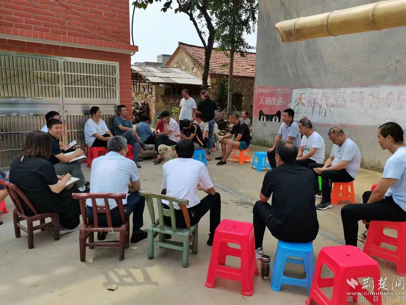 荆楚网(湖北日报网)讯(通讯员邓江峰)8月25日上午,大悟县开发区党工委书记、县住建局局长徐诗泽,副局长宁霞到所驻村看望慰问驻村工作队员、检查指导驻村工作,并和大新镇镇长胡城、党委副书记徐健一行到桃园村刘家湾召开屋场院子会。干部、群众坐在一起面对面谈心聊家常,共同为刘家湾人居环境整治出主意、想办法,全力落实为群众办实事、解难题。