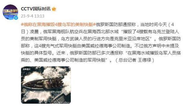 俄罗斯国防部通报称,当地时间今天(4日)凌晨,俄军黑海舰队航空兵在黑海西北部水域“摧毁了4艘载有乌克兰登陆人员的美制军用快艇,乌方武装人员的行进方向是克里米亚沿岸地区”。俄罗斯国防部称,这4艘充气式军用快艇由美国威拉德海事公司制造。不过俄方声明中未提及快艇的具体型号。近来,俄罗斯国防部已多次通报称“在黑海水域摧毁乌军人员搭乘的、美国威拉德海事公司制造的军用快艇”。(总台记者王德禄)
