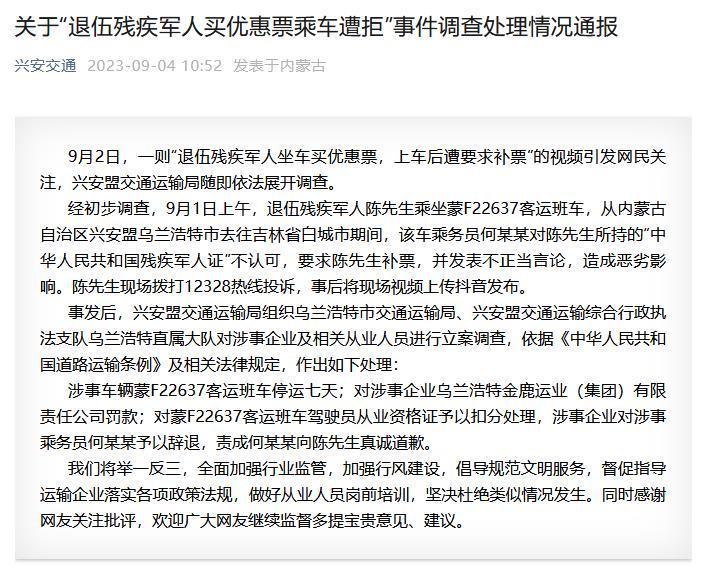 经初步调查,9月1日上午,退伍残疾军人陈先生乘坐蒙F22637客运班车,从内蒙古自治区兴安盟乌兰浩特市去往吉林省白城市期间,该车乘务员何某某对陈先生所持的“中华人民共和国残疾军人证”不认可,要求陈先生补票,并发表不正当言论,造成恶劣影响。陈先生现场拨打12328热线投诉,事后将现场视频上传抖音发布。