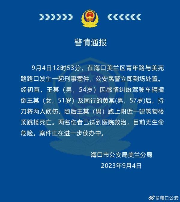 央视网消息:据海南省海口市公安局,9月4日12时53分许,在海口美兰区青年路与美苑路路口发生一起刑事案件,公安民警立即到场处置。