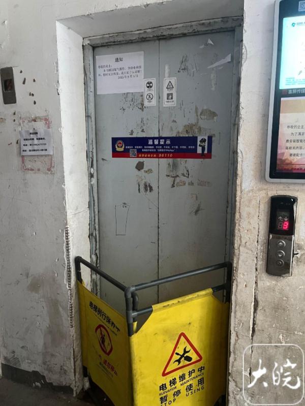 随后,大皖新闻记者来到事发楼栋单元门处,该楼栋两部电梯其中一部能正常使用,另外一部电梯门上张贴通知,通知提到电梯损坏,暂时无法恢复,落款时间是9月3日。