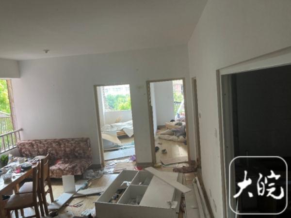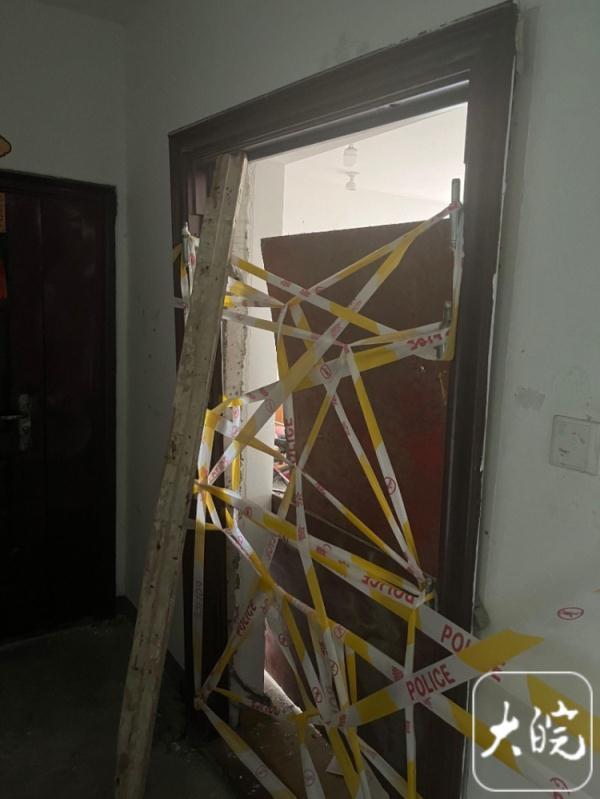 大皖新闻记者沿着楼梯上楼,在3层,记者看到其中一部电梯门已经损坏,旁边放置黄色的围挡。在4层,记者看到事发房屋大门已经没有了,门框上缠绕着警戒线。客厅里柜子损坏倒在地上,屋内一片狼藉。