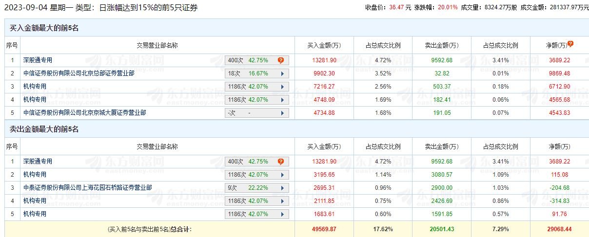 中国经济网北京9月4日讯 易华录(300212.SZ)股价今日涨停,收报36.47元,涨幅20.01%。