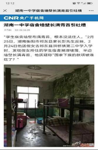 近日,“元气面条sl02”等自媒体账号发布关于广西中小学校舍负面信息的图文,配有宿舍内墙壁长满青苔的图片(见图1),引起网友的关注和讨论。由于相关图片并未注明拍摄的时间地点,经核查,该图片实为几年前某省某中学一女生宿舍的图片,央广网于2016年2月进行过相关报道(见图2)。