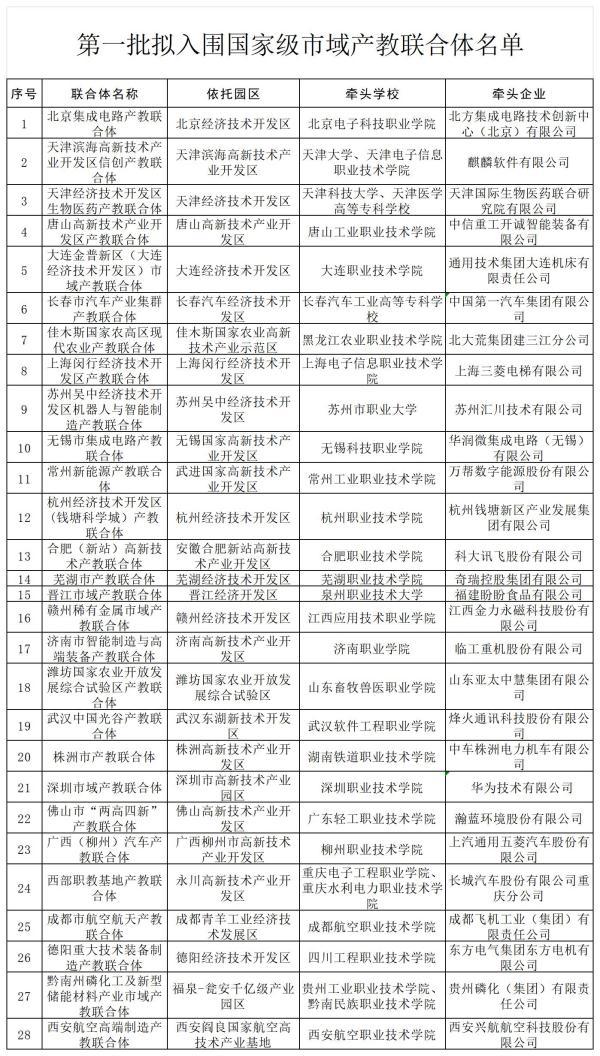 央视网消息:据教育部网站消息,根据《教育部办公厅关于开展市域产教联合体建设的通知》(教职成厅函〔2023〕15号)的有关要求,教育部组织开展了国家级市域产教联合体遴选工作。经各地申报、专家评审、部内复核,首批拟择优确定28家国家级市域产教联合体。现公示名单,公示时间为2023年9月5日—9月11日。如有异议,请在公示期内以实名方式向教育部职业教育与成人教育司反映,逾期及匿名反映不予受理。