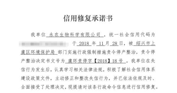 永农生物提请对“责令停产整治”进行信用修复的承诺书(央广网发 记者截图)