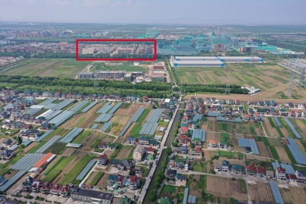 从航拍画面可以看到,盖北镇镇海村与永农生物较为接近,直线距离目测约一公里,在镇海村和永农生物之间,还有一个正在作业的建筑工地。