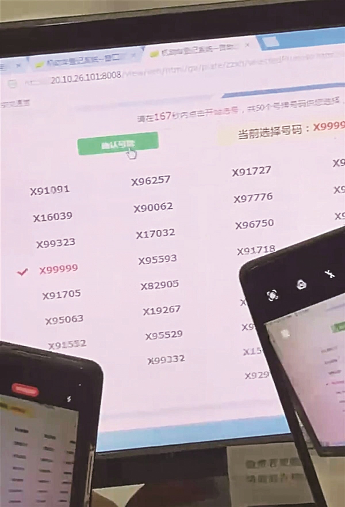 网传视频显示,在一车管所内,有人在电脑前选车牌号,从摇出的众多号码中选择了“X99999”,完整信息为“冀X99999”。不少网友直呼,这车主运气也太好了。