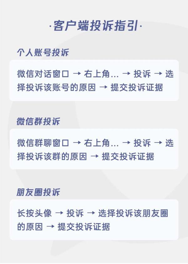 若在微信平台遇到此类欺诈骗局,可通过微信客户端或腾讯卫士小程序进行投诉。