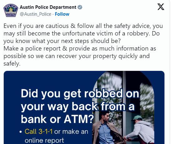 奥斯汀警方在社交媒体推特上发文说,居民被抢劫后可以拨打311或进行线上报告。311是一个通常用于非紧急投诉的号码。奥斯汀警察局写道:“即使你很小心并遵循了所有安全建议,仍然有可能成为不幸的抢劫案受害者。报警时提供尽可能多的信息,这样我们才能快速追回你的财产。”警方还建议在拨打311时提供具体银行,注明取钱的日期和时间。
