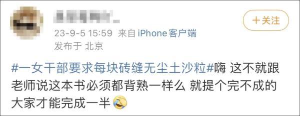 “辽宁一女干部要求每块砖缝无尘土”一事