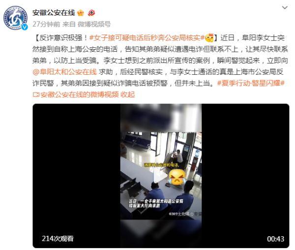 近日,阜阳李女士突然接到自称上海公安的电话,告知其弟弟疑似遭遇电诈但联系不上,让其尽快联系弟弟,以防上当受骗。李女士想到之前派出所宣传的案例,瞬间警觉起来,立即向@阜阳太和公安在线 求助,后经民警核实,与李女士通话的正是上海市公安局反诈民警,其弟弟因接到疑似诈骗电话被预警,但并未上当。