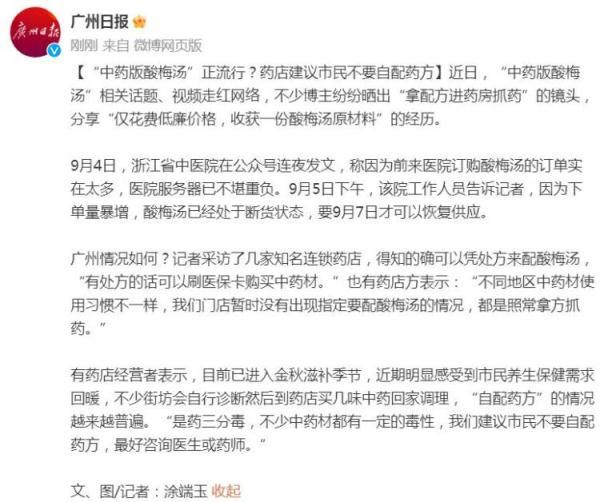 9月4日,浙江省中医院在公众号连夜发文,称因为前来医院订购酸梅汤的订单实在太多,医院服务器已不堪重负。9月5日下午,该院工作人员告诉记者,因为下单量暴增,酸梅汤已经处于断货状态,要9月7日才可以恢复供应。