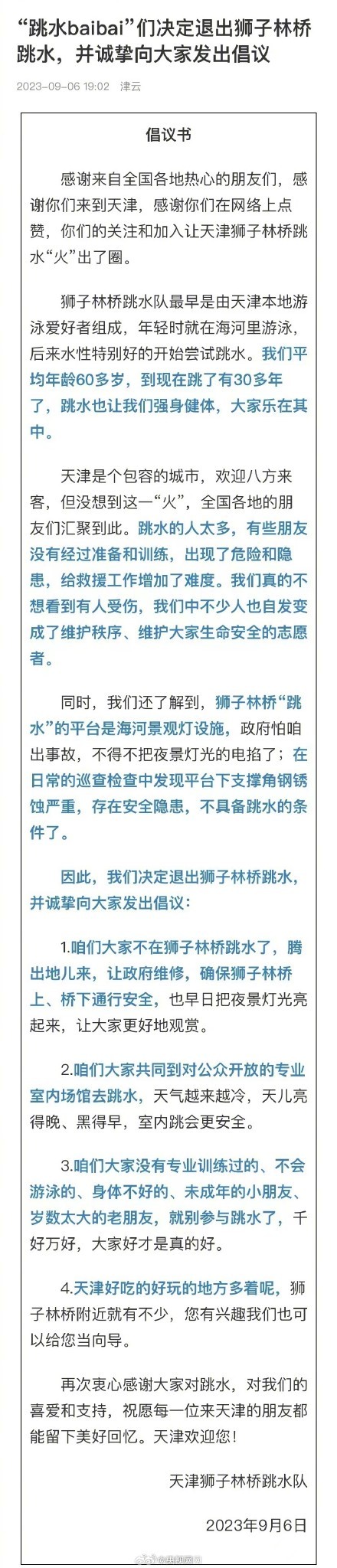 “我们真的不想看到有人受伤。”9月6日,天津狮子林桥跳水队发布倡议书,宣布决定退出狮子林桥跳水,并诚挚向大家发出倡议:“咱们大家不在狮子林桥跳水了。”