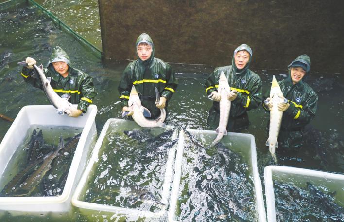 鲟鱼谷工作人员正在对鲟鱼进行“分池”。 (通讯员 望作信 摄)