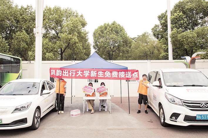 9月6日,极目新闻记者在武汉火车站看到,一家网约车公司设立大学新生接送点,免费接送大学新生去学校。