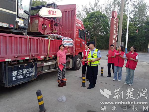 在沙洋县后港镇,从外地前来的收割机数量增加,后港水陆派出所民警加强夜间和清晨等时段的巡逻,引导收割机运输车辆安全、有序集中停放,加强交通安全、防盗、反诈等提示,消除相关安全隐患,进一步畅通水稻收割“平安路”。