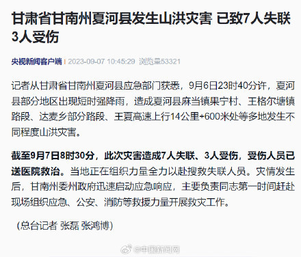 记者从甘肃省甘南州夏河县应急部门获悉,9月6日23时40分许,夏河县部分地区出现短时强降雨,造成夏河县麻当镇果宁村、王格尔塘镇路段、达麦乡部分路段、王夏高速上行14公里+600米处等多地发生不同程度山洪灾害。截至9月7日8时30分,此次灾害造成7人失联、3人受伤,受伤人员已送医院救治。当地正在组织力量全力以赴搜救失联人员。(央视新闻客户端)