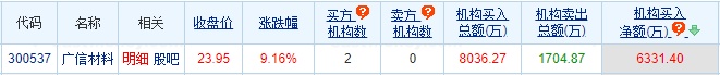 龙虎榜数据显示,今日买入广信材料金额最大的前五名中,有2家机构专用席位。经统计,机构席位今日买入广信材料净额为6331.40万元。