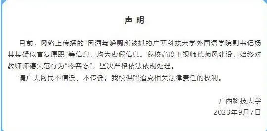 目前,网络上传播的“因酒驾躲厕所被抓的广西科技大学外国语学院副书记杨某某疑似官复原职”等信息,均为虚假信息。我校高度重视师德师风建设,始终对教师师德失范行为“零容忍”,坚决严格依法依规处理。