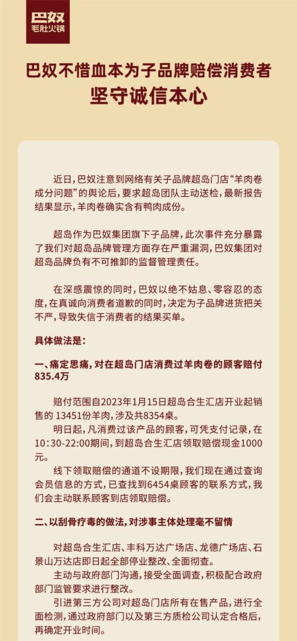 9月7日,巴奴通过其微信公众号发布消息称,根据超岛团队最新送检报告,结果显示其羊肉卷确实含有鸭肉成分。对此巴奴要求超岛多家门店停业整改,取消独立采购权,同时对在合生汇店消费过该产品的顾客进行赔付。此次赔付共涉及8354桌,总额约为835.4万元,每桌可领取1000元。