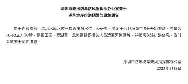 9月8日,深圳市防汛防旱防风指挥部办公室发布紧急通告,深圳水库水位已接近汛限水位,经研究,决定于9月8日0时15分开始排洪。