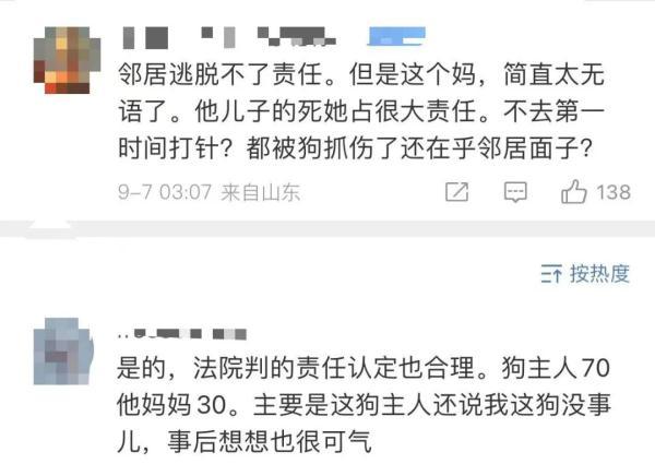 原来,事发当日儿子被抓伤后,母亲王女士曾带儿子去医院打狂犬疫苗。在医院她碰到了邻居,邻居告诉她狗没有问题,她当时感觉“非得打针跟讹人一样,于是就没有打,想着回到(工作地)浙江后再打”,可是等她带儿子回浙江后,儿子就出现了发烧、恐水的症状。