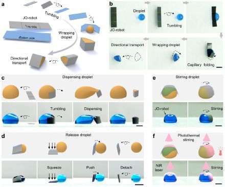 据中国科学技术大学8日消息,该校研究团队及其合作者,利用飞秒激光微纳制造方法,制备了一种可用于跨尺度液滴操纵的磁响应双面神折纸机器人,实现了多样化液滴操纵功能的有效集成,包括液滴的三维运输、合并、分裂、子液滴分发与按需释放、搅拌以及远程加热等。这对精细化工、医疗诊断和微流体技术等广泛需要精确获取和添加试剂、微液滴图案化和快速微液滴反应的领域具有重要意义。该研究成果日前发表于《自然·通讯》。(科技日报记者 吴长锋,图片来源:中国科学技术大学)