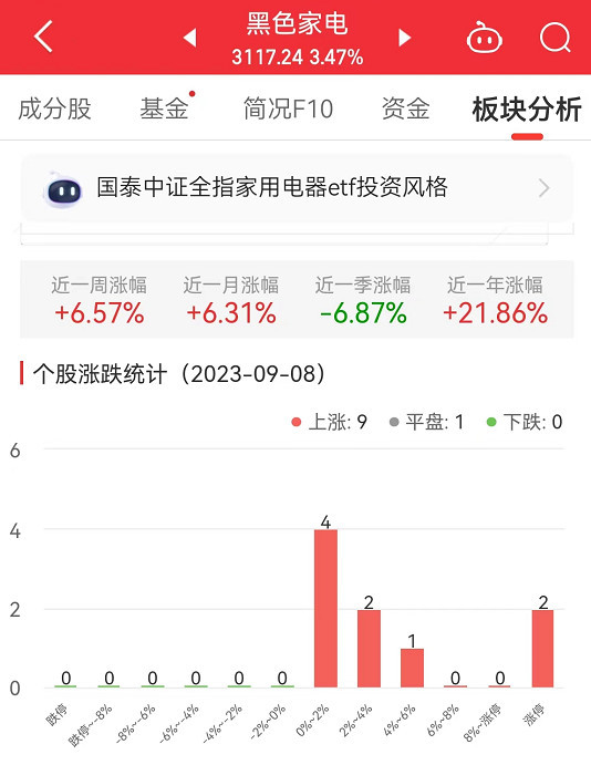 中国经济网北京9月8日讯 今日,黑色家电板块整体涨幅3.47%,其中,9只股票上涨,1只股票平盘,0只股票下跌。