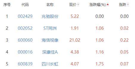 兆驰股份、ST同洲、海信视像、深康佳A、四川长虹位列涨幅榜后五位,涨幅分别为0.00%、1.06%、1.06%、1.16%、1.75%。