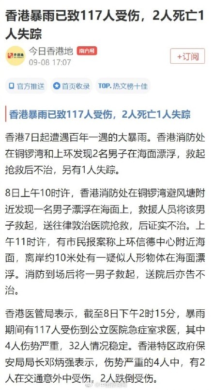 香港7日起遭遇百年一遇的大暴雨。香港消防处在铜锣湾和上环发现2名男子在海面漂浮,救起抢救后不治,另有1人失踪。香港医管局表示,截至8日下午2时15分,暴雨期间有117人受伤到公立医院急症室求医,其中4人伤势严重,32人情况稳定。(南方+)
