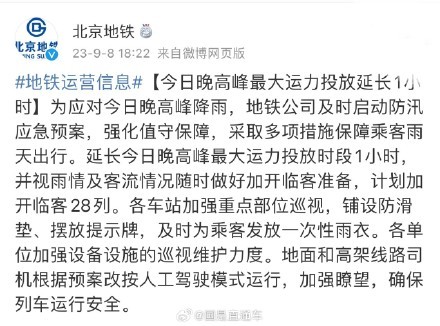 据北京地铁官博消息,为应对今日晚高峰降雨,地铁公司及时启动防汛应急预案,强化值守保障,采取多项措施保障乘客雨天出行。延长今日晚高峰最大运力投放时段1小时,并视雨情及客流情况随时做好加开临客准备,计划加开临客28列。各车站加强重点部位巡视,铺设防滑垫、摆放提示牌,及时为乘客发放一次性雨衣。各单位加强设备设施的巡视维护力度。地面和高架线路司机根据预案改按人工驾驶模式运行,加强瞭望,确保列车运行安全。
