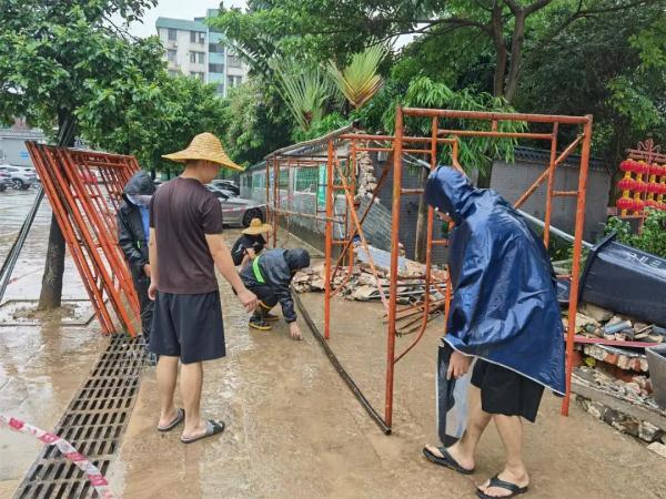 记者从余荫山房了解到,8日凌晨,余荫山房发现外围排水设施及河涌水位出现超出警戒线情况后,立即启动应急预案,增派人手并采取相应措施,并迅速将相关情况上报主管部门和区文物办,拉起警戒线,防止二次事故发生,并第一时间对园区文物、设施和辖区的其它围墙进行检查,要求员工在确保自身安全的前提下进行抢险救灾工作。