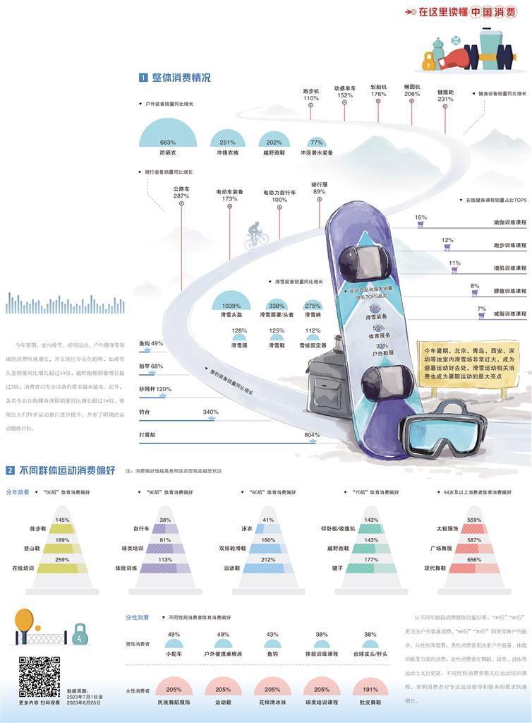 值得注意的是,运动服务消费需求稳步上升,如健身教练、网上课程、场馆预订、健身APP等相关消费出现较高增长。运动服务范围很广泛,既能丰富人们的日常生活,也能促进人们享受运动乐趣。随着数字技术、智能技术应用到体育场景,将给人们带来新的运动体验。