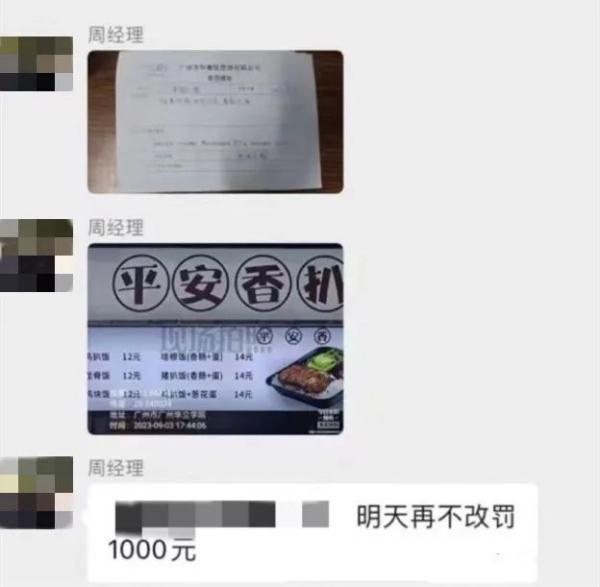 9月4日,一名网友晒出两张图片,其中一张是《广州芳华餐饮管理有限公司处罚通知》。该“处罚通知”显示,一家名为“平安扒饭”的档口被罚款300元,理由是“饭类价格低于13元,屡教不改”,罚单开具日期是9月3日,档口负责人未签字。另一张图片是微信聊天截图,一位名叫“周经理”的人称“明天再不改罚1000元”。