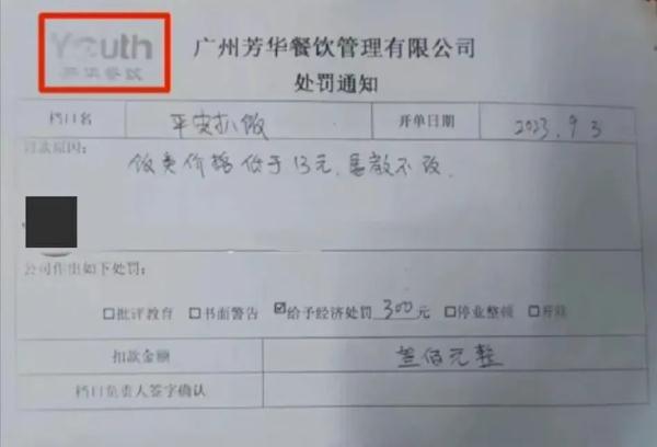 广州芳华餐饮管理有限公司开具的处罚通知(央广网发 图片来源于网友)