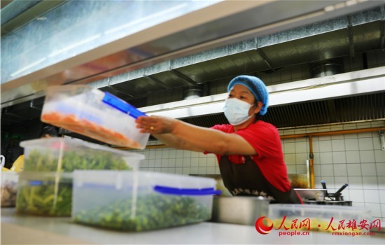 临近饭点,荆冬英正在社区食堂进行配菜。 人民网记者李雪晴摄