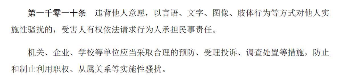 可能大部分人对于性骚扰的理解仍停留在肢体接触等实际行为方面,但事实上,法律对性骚扰的定义并不止于此。《中华人民共和国民法典》第一千零一十条规定,违背他人意愿,以言语、文字、图像、肢体行为等方式,对他人实施性骚扰的,受害人有权依法请求行为人承担民事责任。根据这一条的规定,性骚扰的方式不限于身体接触,发黄色消息、讲黄色段子等引起被害人厌恶反感的,同样也属于性骚扰。