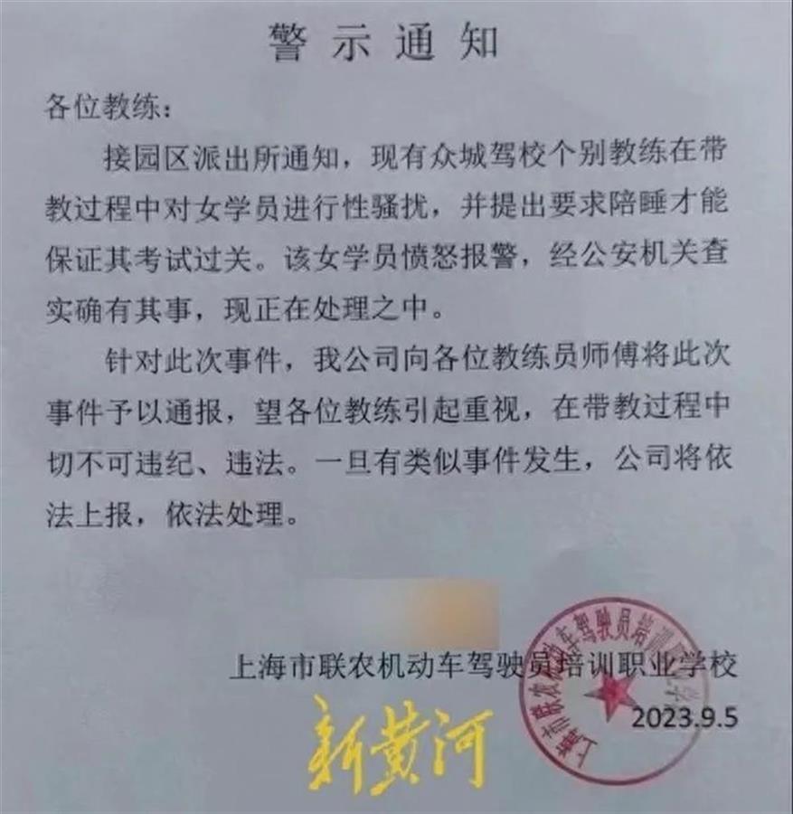 近日,网传一则上海市联农机动车驾驶员培训职业学校发布的《警示通知》。该通知写道,当地众城驾校有个别教练对女学员性骚扰,要求陪睡才能保证考试过关。对此,涉事的众城驾校负责人告诉记者:“教练员确实对女学员说过轻浮的话,但从未提出过‘陪睡’要求。目前双方已经和解。”报道称,上海市公安局浦东分局惠园派出所的工作人员称已受理此案,“性骚扰”一事存在争议,但涉事教练已对当事人进行赔偿。(9月8日 九派新闻)