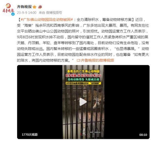 近日,受“海葵”残余环流和西南季风的影响,广东多地出现大暴雨、暴雨。有网友在社交平台晒出佛山中山公园动物园的照片,引发担忧。动物园运营方工作人员表示,9月8日6时发现积水排不动后,园内留守的值班工作人员紧急将积水严重区域的黑天鹅、丹顶鹤、羊驼、盘羊等转移到了园内高处,目前动物们没有生命危险,没有动物失踪或出逃。园内暂未转移的一些猛兽或因圈舍积水,“也显得暴躁。”动物园运营方工作人员表示,目前动物园在配合排水作业的同时,也在筹备“如有更大的降水,将园内动物转移的方案。”