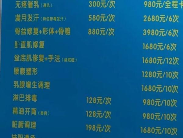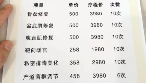 汪先生告诉记者,他调查了几家产康机构的价格,“长沙市妇幼是1000元三次,还有两家月子会所,一家是500元一次,另一家是800元一次,800元还包括全身修复。”袁女士也说,做完两次宫颈脱垂复位后,她觉得没有什么效果,开始对月子中心产生质疑,也怀疑遭到了价格刺客。