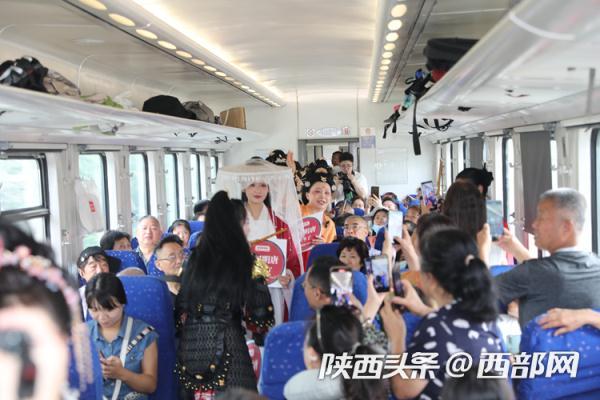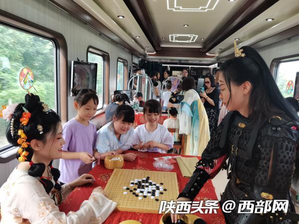列车精心打造了“汉唐文化体验馆”车厢,为旅客带来了别样的体验感,前来体验的旅客置身其中,仿佛穿越大唐,这也是国铁西安局为丰富旅客出行场景,提升客运服务品质推出的新举措。