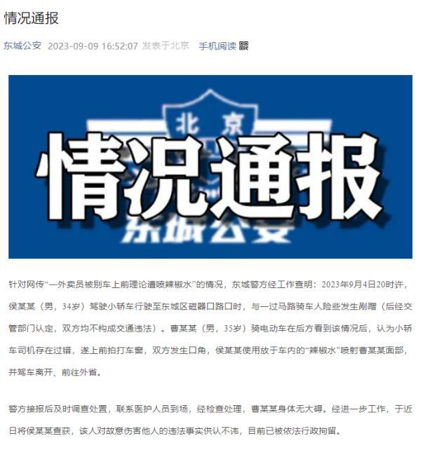 据东城公安消息,针对网传“一外卖员被别车上前理论遭喷辣椒水”的情况,东城警方经工作查明:2023年9月4日20时许,侯某某(男,34岁)驾驶小轿车行驶至东城区磁器口路口时,与一过马路骑车人险些发生剐蹭(后经交管部门认定,双方均不构成交通违法)。曹某某(男,35岁)骑电动车在后方看到该情况后,认为小轿车司机存在过错,遂上前拍打车窗,双方发生口角,侯某某使用放于车内的“辣椒水”喷射曹某某面部,并驾车离开、前往外省。