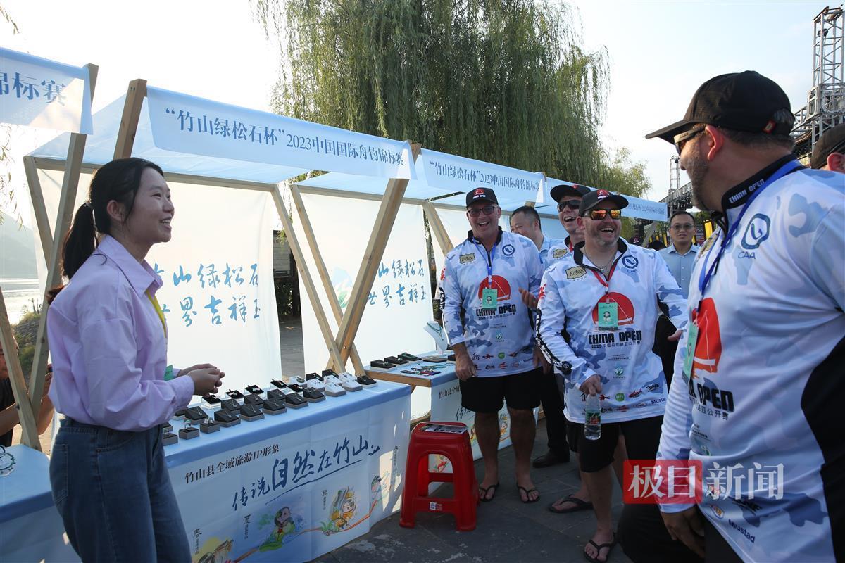 在“竹山绿松石杯”2023中国国际舟钓锦标赛开幕式现场的展区内,精美的绿松石挂件、摆件、手链等,让国内外的精英钓手们爱不释手。