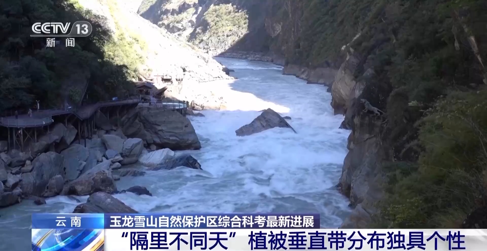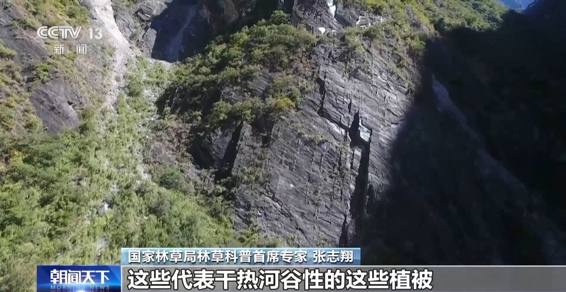 国家林草局林草科普首席专家 张志翔:如果我们在虎跳峡往上一看,看到的绝大部分是一种竹子,箭竹,当地人把它叫做扫帚竹。这地方有很多出现了另外一栎类,多变石栎,在南侧是没有的,多变石栎的出现其实在某种意义上可以代表的是亚热带常绿阔叶林的一个基本典型物种。再往高山走,包括虎跳峡到龙蟠乡,再往高山走最终还是汇入到高山的植被特征,暗针叶林 。