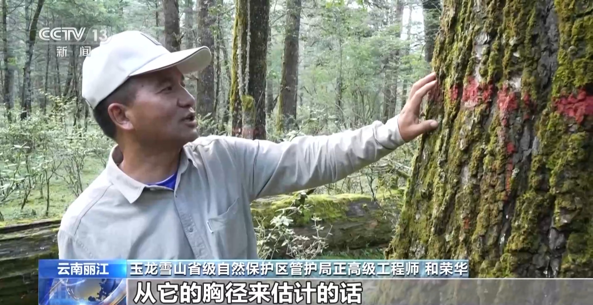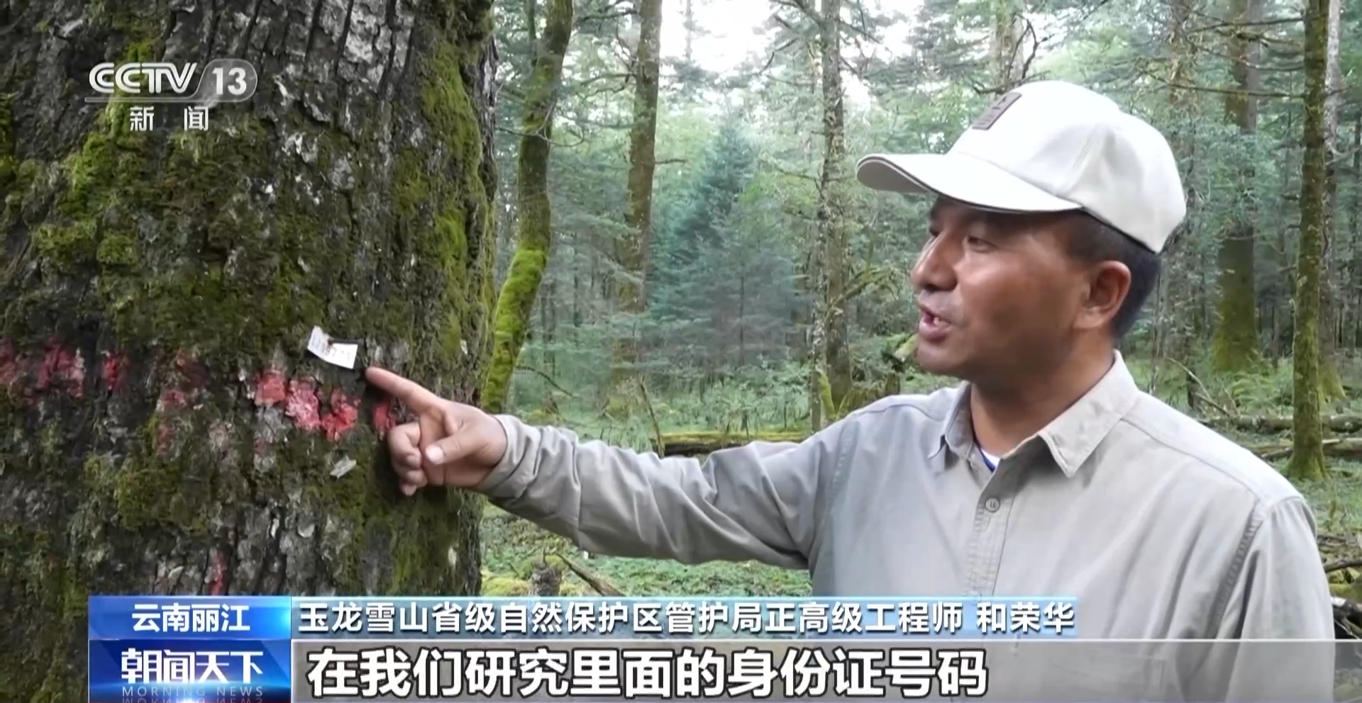 玉龙雪山省级自然保护区管护局正高级工程师 和荣华:这红线是我们量胸径的位置,这个牌就等于这棵树在我们研究里面的身份号码 ,这个号码对应下面记录很多它的数据,像树高、树龄、胸径还有冠幅等。