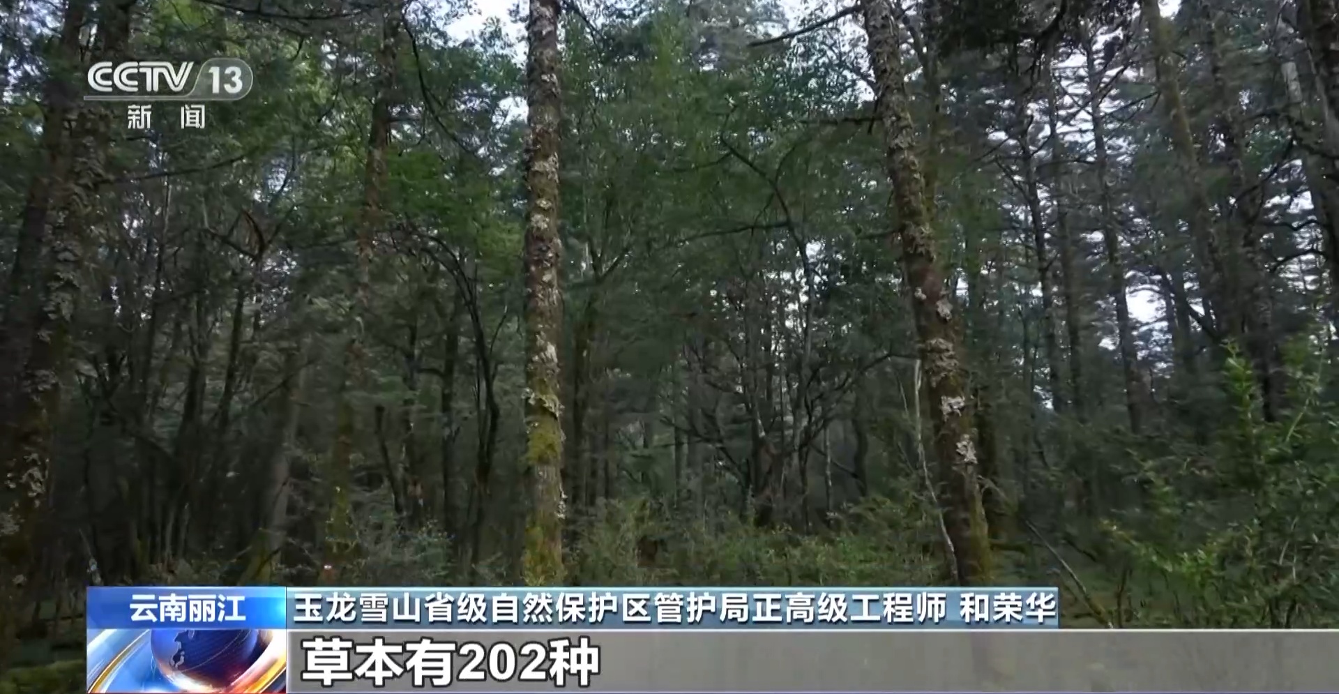 玉龙雪山省级自然保护区管护局正高级工程师 和荣华:大样地总的植物种类,我们第一期调查数据里面有乔木66种,草本有202种,大型真菌有145种。